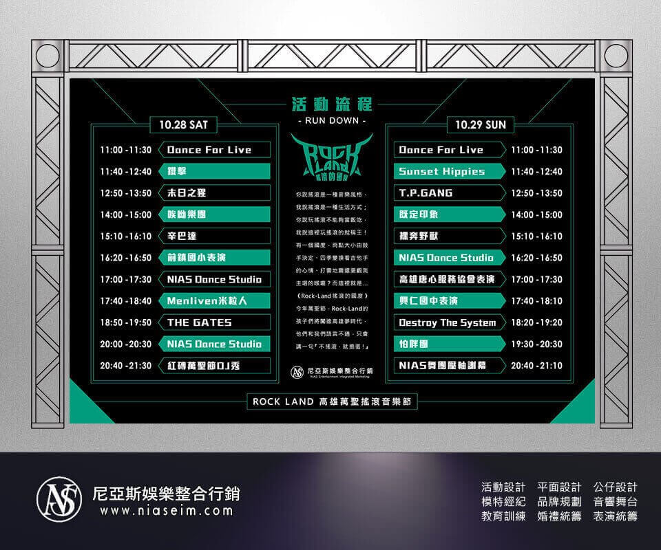 我們JIS傑欣集結了喜愛活動、熱愛表演、搖滾音樂的夥伴們在高雄夢時代,舉辦一場動人心懸、熱血沸騰的搖滾音樂節!現場不僅有十多組獨立樂團現場表演,也邀請了各個地區單位的公益表演,還有數十攤特色市集,並且結合了草衙聯盟不山不市專案,關懷弱勢單位學校,結合公益捐款,打造一場連續兩天震撼地表的公益藝術活動。